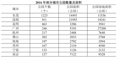 2016年,全国城市公园数量排名前五的省份依次是广东、浙江、江苏、山东和云南,公园数量分别为3512个、1171个、942个、828个和683个。其中,广东省的公园面积达到65318公顷,占全国公园面积的比重超过17%;公园绿地面积达到89591公顷,占全国公园绿地面积的比重约为14%。